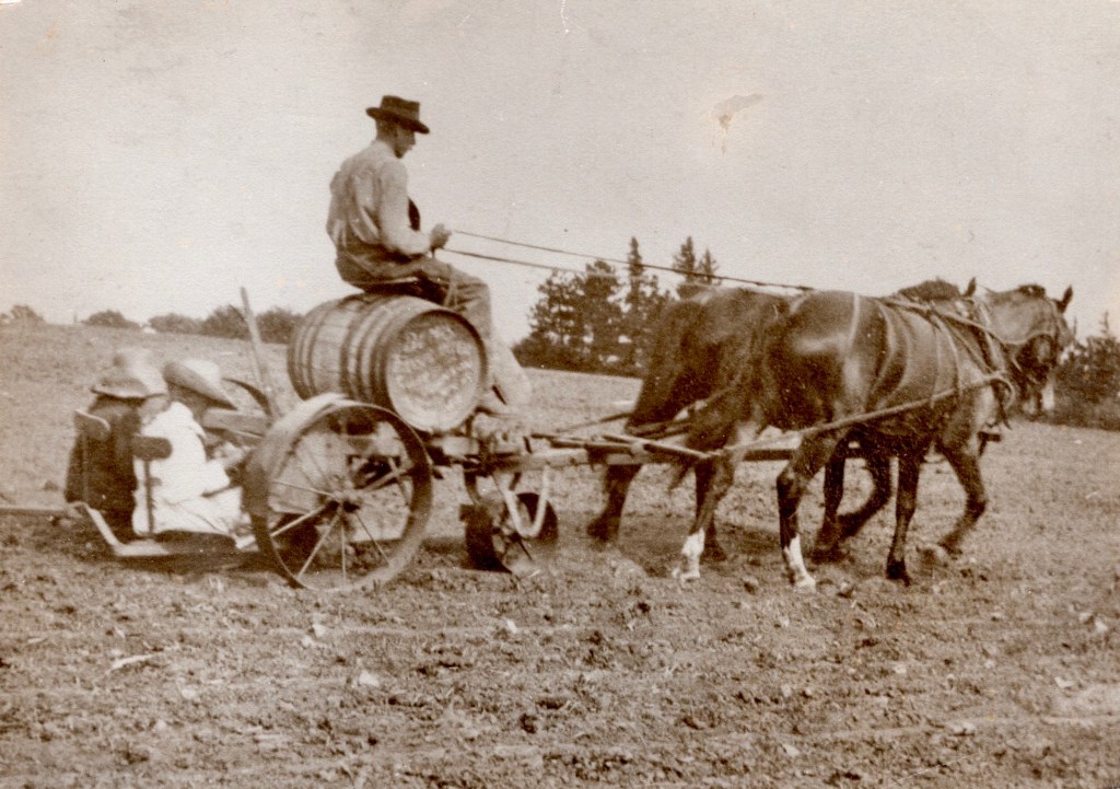 I only have two photos of Grandpa Anton Anderson. The first is above – an enlargement of Anton from the photo I posted a few days ago (see this post). The second is below – Grandpa Anderson on his horse-drawn planter while his daughters Elvina and Nora plant tobacco. This photo was taken around 1908 when the Andersons were living on Rockdale Street in Cambridge, Wisconsin and working on local tobacco farms (here they were working on the Knud Henderson farm).