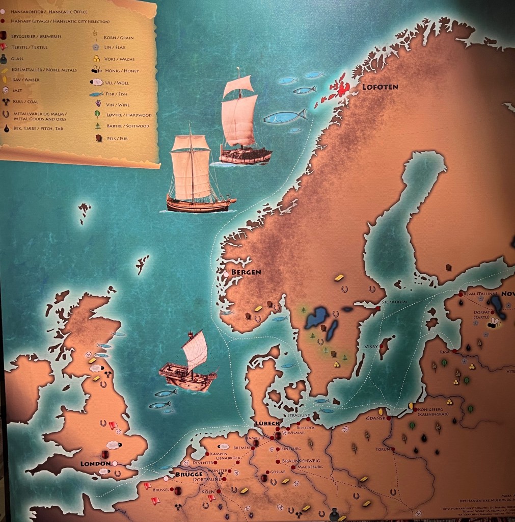 At this point you must be thinking, “Very pretty pictures, Jesse, but what does this have to do with the trade in stockfish?” Ah… that’s where Norway comes in. One of the most important Hanseatic outposts was in Bergen (see my post from a couple of weeks ago). The Hanseatic merchants’ kontor in Bergen was where Europe got its stockfish. And stockfish was big business back in the days before refrigeration.