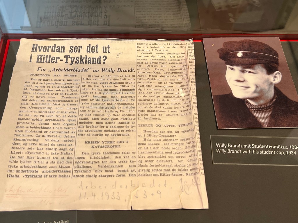 Brandt came to Norway in 1933 to escape persecution from the Nazis, and he quickly became involved with leftist politics and journalism in Norway. Within weeks Brandt was publishing articles in Norwegian about Hitler’s rise to power and urging Norwegians to resist fascism. He also became involved in helping support the nascent workers movement in Norway.