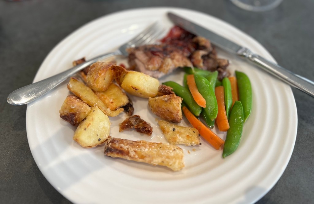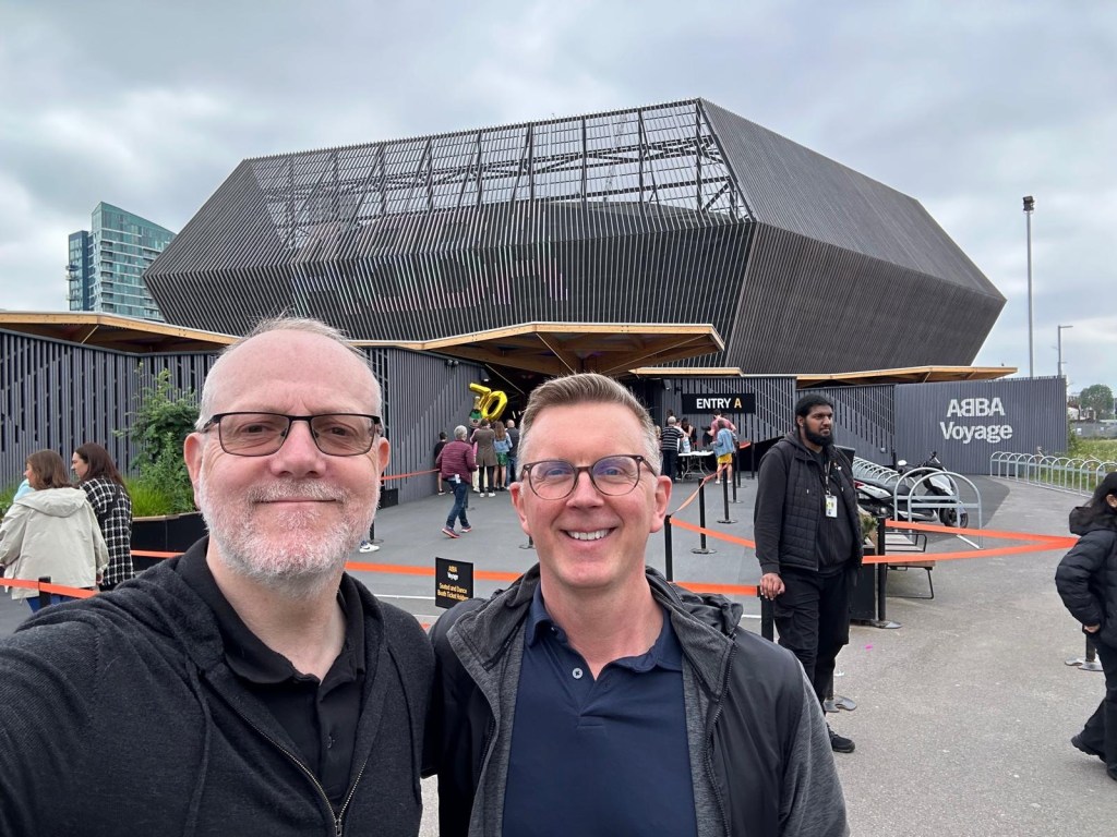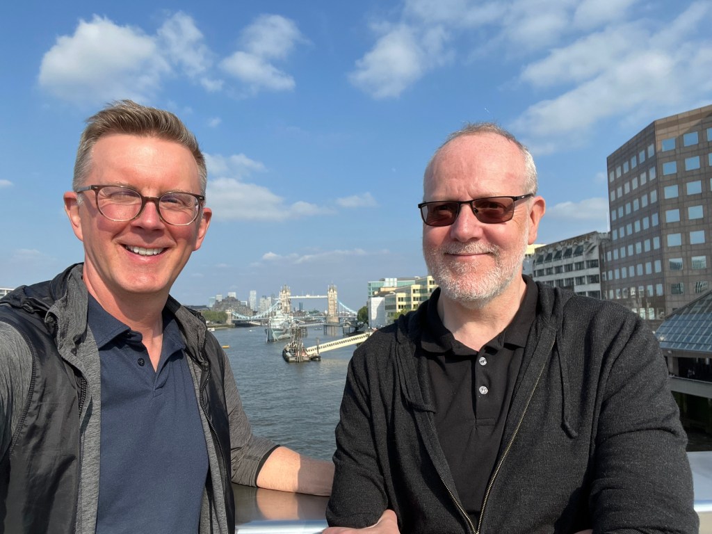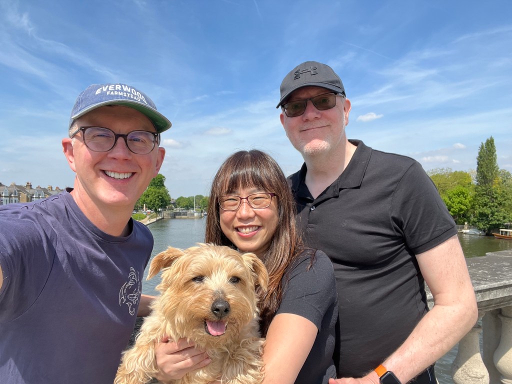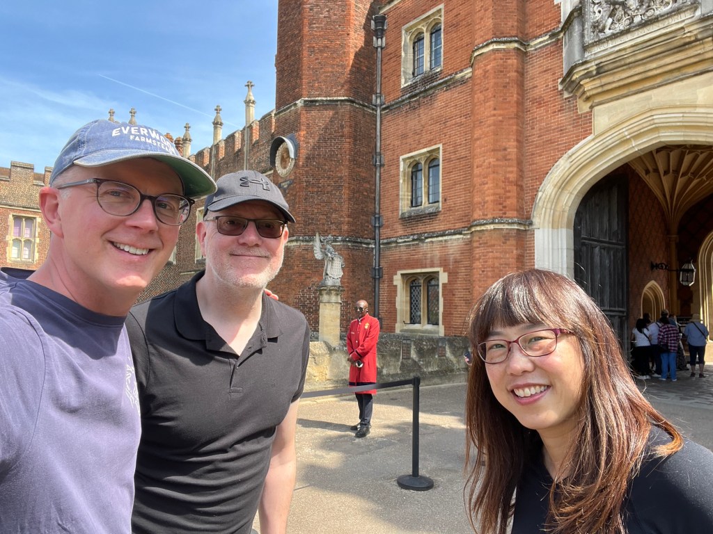 My hosts – Sim, David and Harry – standing on the bridge over the River Thames that leads to Hampton Court Palace