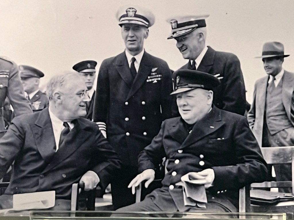Churchill and Roosevelt meeting for the first time during the War (August 1941). In Newfoundland they signed the Atlantic Charter, a declaration of common principles between Britain and the United States. Three days later, Churchill telegraphed the Lord Privy Seal, Clement Attlee, β€œI am sure I have established warm and deep personal relations with our great friend.” (Photo displayed at the Churchill War Rooms)