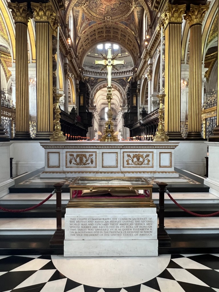 Stepping into St. Paul’s Cathedral yesterday, I was deeply moved to discover that there’s a chapel in one of the most prominent places in the sanctuary β€” directly behind the high altar β€” which β€œcommemorates the common sacrifices of the British and American peoples during the Second World War and especially those American service men whose names are recorded in its roll of honour.”