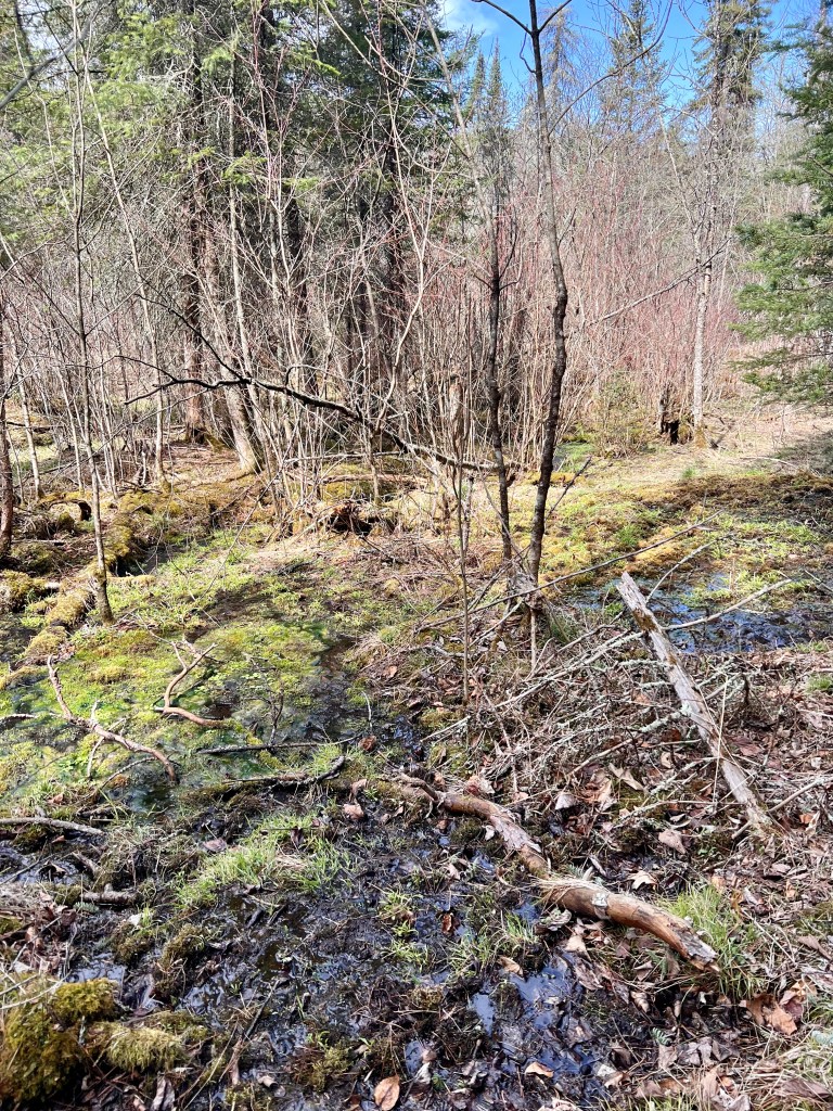 This was the most beautiful and peaceful moment of the morning. The trail led us to the east side of Nicollet Lake. The wind in the tall pines sounded like waves crashing on a beach. No people, only the occasional squirrel or grouse. I realized I wouldn’t get to the point on my map by staying on the trail, so we ventured off in what I hoped was the right direction. After much scrambling over hills and through dense underbrush, we found a little creek trickling into Nicollet Lake. Is this you, Mississippi? It seems as good a spot as any to start a river.