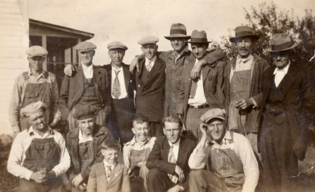 Back row (from left): Everett Anderson (Marie & Anton’s son), Hans Anderson (Berte’s husband/Anton’s brother), Albert Greibesland (Andreas’s son, visiting from Norway), Sigurd Greibesland (also from Norway), Frank Smith (Elvina’s husband), Adolph Petry (Ingeborg’s son-in-law/Anna’s husband), Anton Anderson (Marie’s husband/Elvina’s father), Andrew Alfson (Marie’s brother)