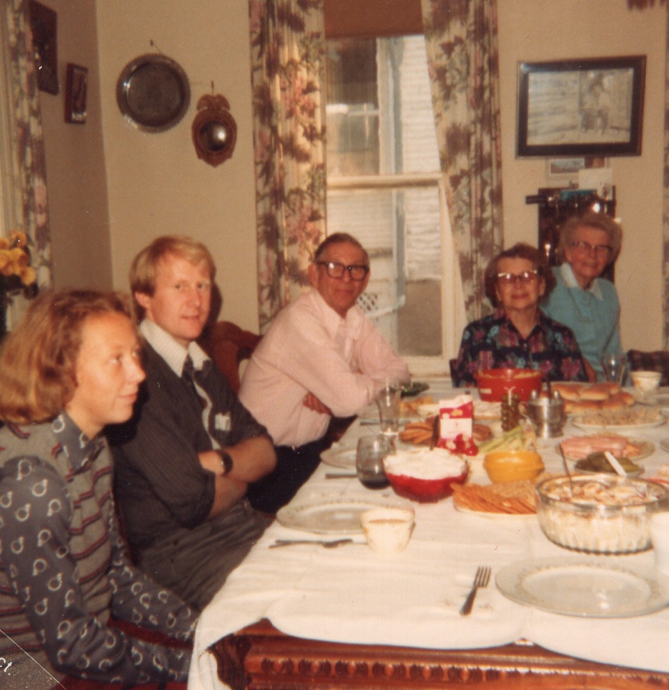At the home of Elvina Anderson Smith in Fort Atkinson, WI, 1981: from left are Halldis Greibesland Larsen, Reidar Larsen, Eugene Smith, Manda Anderson Frey (Elvina’s sister), and Elvina Anderson Smith And two years after this, my grandpa’s sister Shirley Smith Stork and her cousin Lois Frey Febock (daughter of Elvina’s sister Nora Anderson Frey) made the trek to Kristiansand and the Greibesland family farm in Øvrebø.