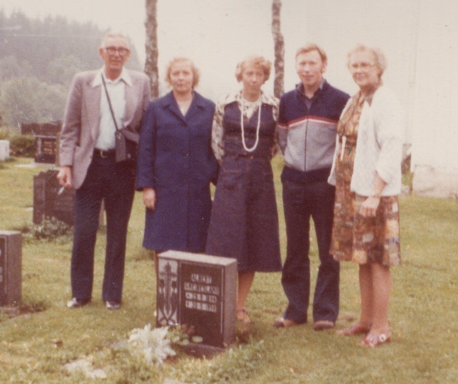 Visit to Norway in 1979; at the gravesite of Albert Greibesland at Øvrebø Church; from left are Eugene Smith (my maternal grandpa), Torbjørg Røyseland Greibesland (Albert’s wife), Halldis Greibesland Larsen (Albert & Torbjørg’s daughter), Alf Greibesland (Albert & Torbjørg’s son), and Phyllis Reiner Smith (my maternal grandma) Two years later, Halldis and her husband Reidar Larsen visited the U.S., staying with my grandparents in Wisconsin as well as my immediate family (then living in Syracuse, Indiana).