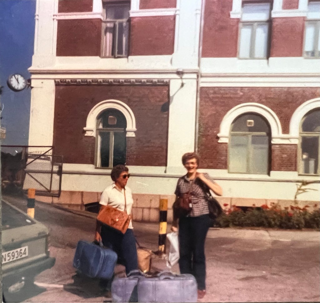 Lois Frey Febock (my grandpa’s cousin) and Shirley Smith Stork (my grandpa’s sister) in front of the Kristiansand train station, 1983 Aunt Shirley set me up as a penpal with Halldis and Reidar Larsen’s oldest son, Kjell Inge, and we exchanged a letter or two in those years. I was nine or ten years old at the time.