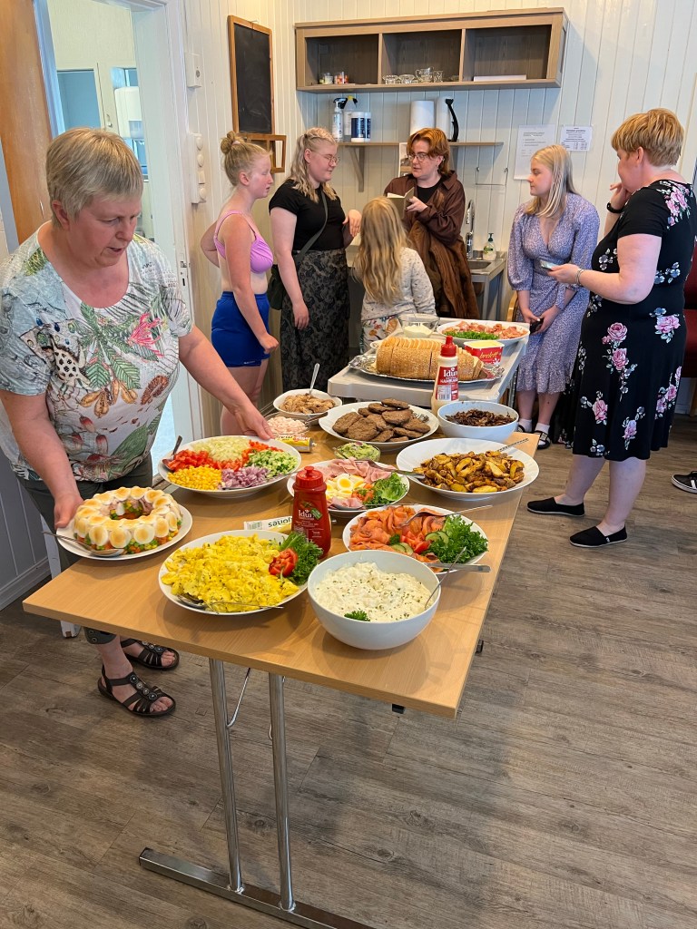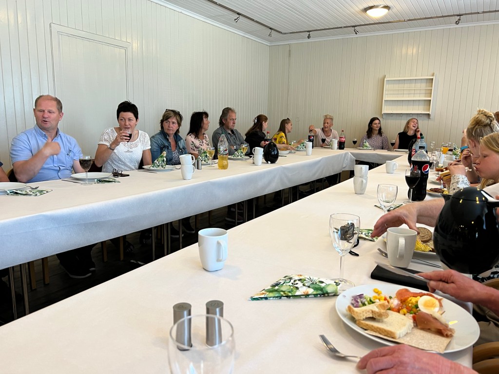 A large gathering of Lindalens! (Descendants of Kristine and Olaus Lindalen) Helene served a multi-course dinner that included rømmegrøt (sour cream porridge), mashed potatoes, eggs, spekkemat (cured meats), salads, fruits, flatbreads and cheeses. It was… heavenly.